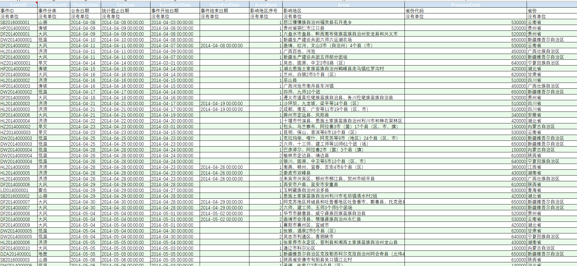 [1]丁宇刚,孙祁祥.气候风险对中国农业经济发展的影响——异质性及机制分析[J].金融研究,2022(09):111-131. 二. 数据指标| 事件ID | 事件分类 | 公告日期 | 统计截止日期 | 事件开始日期 | | 事件结束日期 | 影响地区序号 | 影响地区 | 省份代码 | 省份 | | 城市代码 | 城市 | 币种 | 直接经济损失 | 房屋统计口径 | | 房屋倒塌 | 房屋严重损坏 | 房屋中等损坏 | 房屋轻微损坏 | 不同程度损坏 | | 死亡人数 | 受伤人数 | 伤亡人数 | 失踪人数 | 转移安置人口 | | 受灾人口 | 农作物受灾面积 | 农作物绝收面积 | 灾情概述 | 报告来源 | | 备注 | | | | |