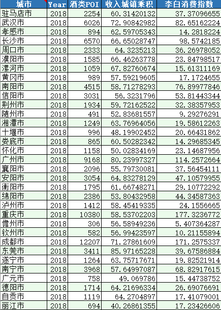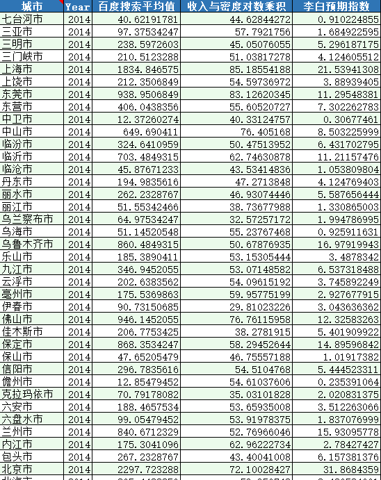 [1]刘逸, 陈海龙, 陈了凡. 饮酒休闲消费偏好的地域特征研究:李白指数[J]. 地理研究, 2024, 43(11): 2935-2951. 二. 数据指标| 城市 | Year | 酒类POI | 收入城镇乘积 | 李白消费指数 | | 百度搜索平均值 | 收入与密度对数乘积 | 李白预期指数 | | |