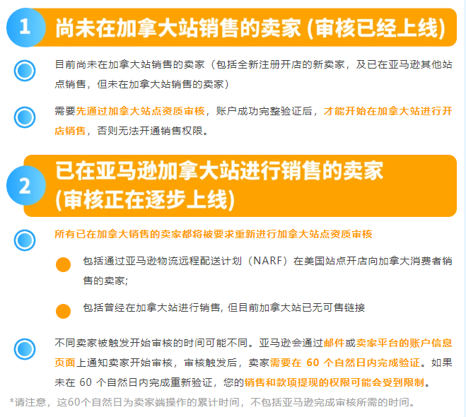 所有需要在Amazon.ca进行销售的卖家均需完成加拿大站点资质审核,未通过审核将无法在加拿大站开店销售。根据不同卖家实际情况,需要进行审核的情况也有所不同,主要有以下两种情况:
