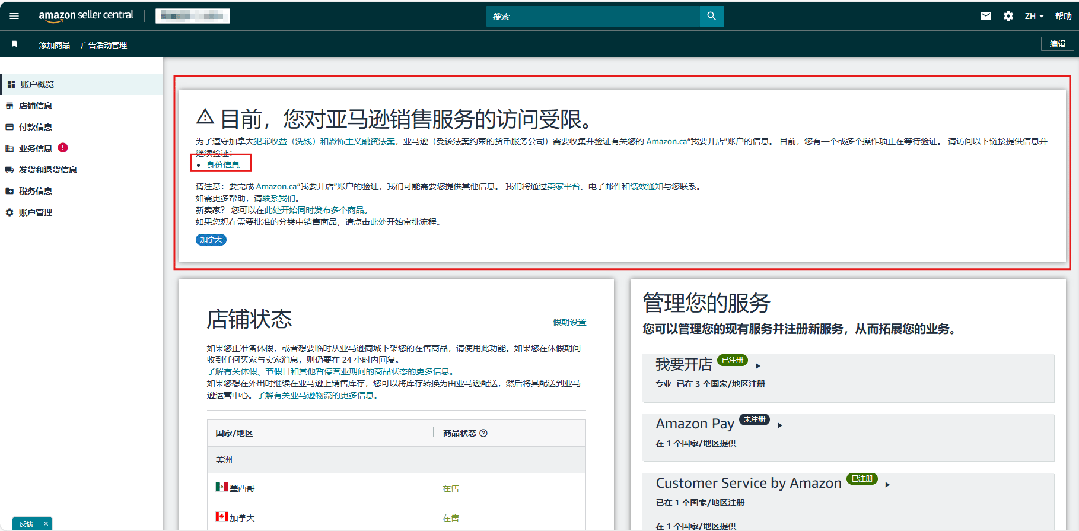 第一步: 通过卖家平台提交材料: 当您进入加拿大站点卖家平台页面,主页提示框会提醒您需要通过加拿大站点资质审核。