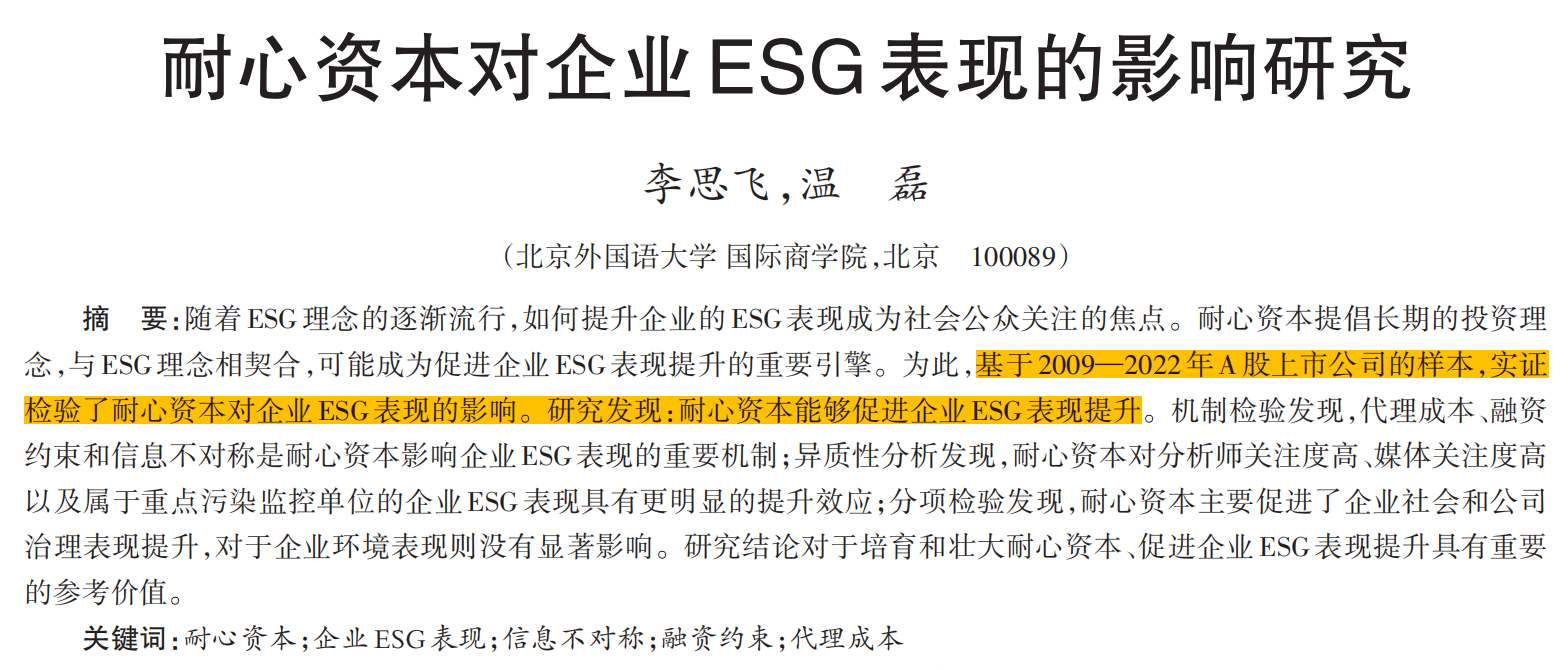 【实证分析】耐心资本对企业ESG表现的影响研究数据集(2009-2024年)