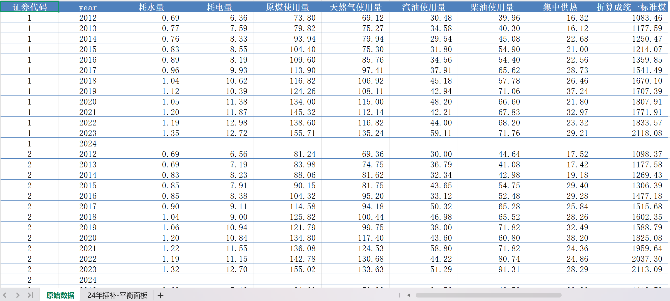 本数据对上市公司2012-2024年的能源消耗量进行整理,涵盖耗水量、耗电量、原煤使用量、天然气使用量、汽油使用量、柴油使用量及集中供热,并根据统一的标准煤进行折算,数据包含原始及平衡面板两个版本