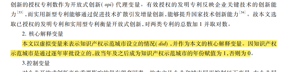 以虚拟变量来表示知识产权示范城市设立的情况,因知识产权示范城市是通过逐年审批设立的,故当年及之后成为知识产权示范城市的年份赋值为1,否则为0