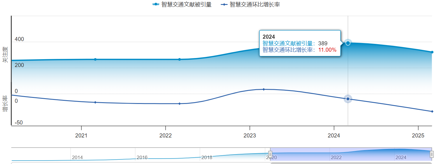 在过去五年中,智慧交通与自动驾驶领域的学术传播度呈现出稳步增长的趋势。根据图表数据,2024年成为了一个显著的高点,该年度相关文献的被引量达到了2747次,环比增长率也达到了29.00%。这一数据不仅反映了智慧交通与自动驾驶研究在学术界的关注度和影响力持续提升,也表明其研究成果在实际应用中的重要性和价值得到了广泛认可。尽管在2025年有所回落,但整体来看,近五年的数据揭示了该领域在学术研究和实践应用中的不断进步和日益增强的影响力,为未来的研究和政策制定提供了重要的参考依据。