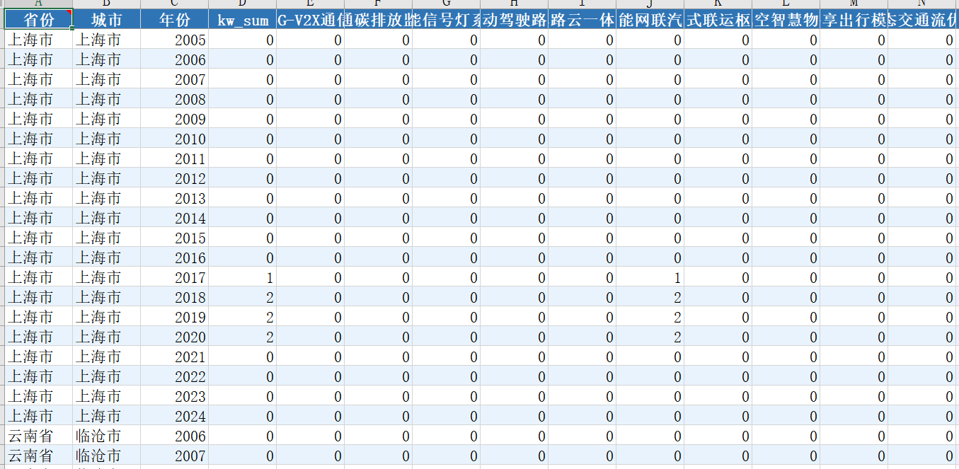 省份 | 城市 | 年份 | kw_sum | 5G-V2X通信 | 交通碳排放监测 | 智能信号灯系统 |