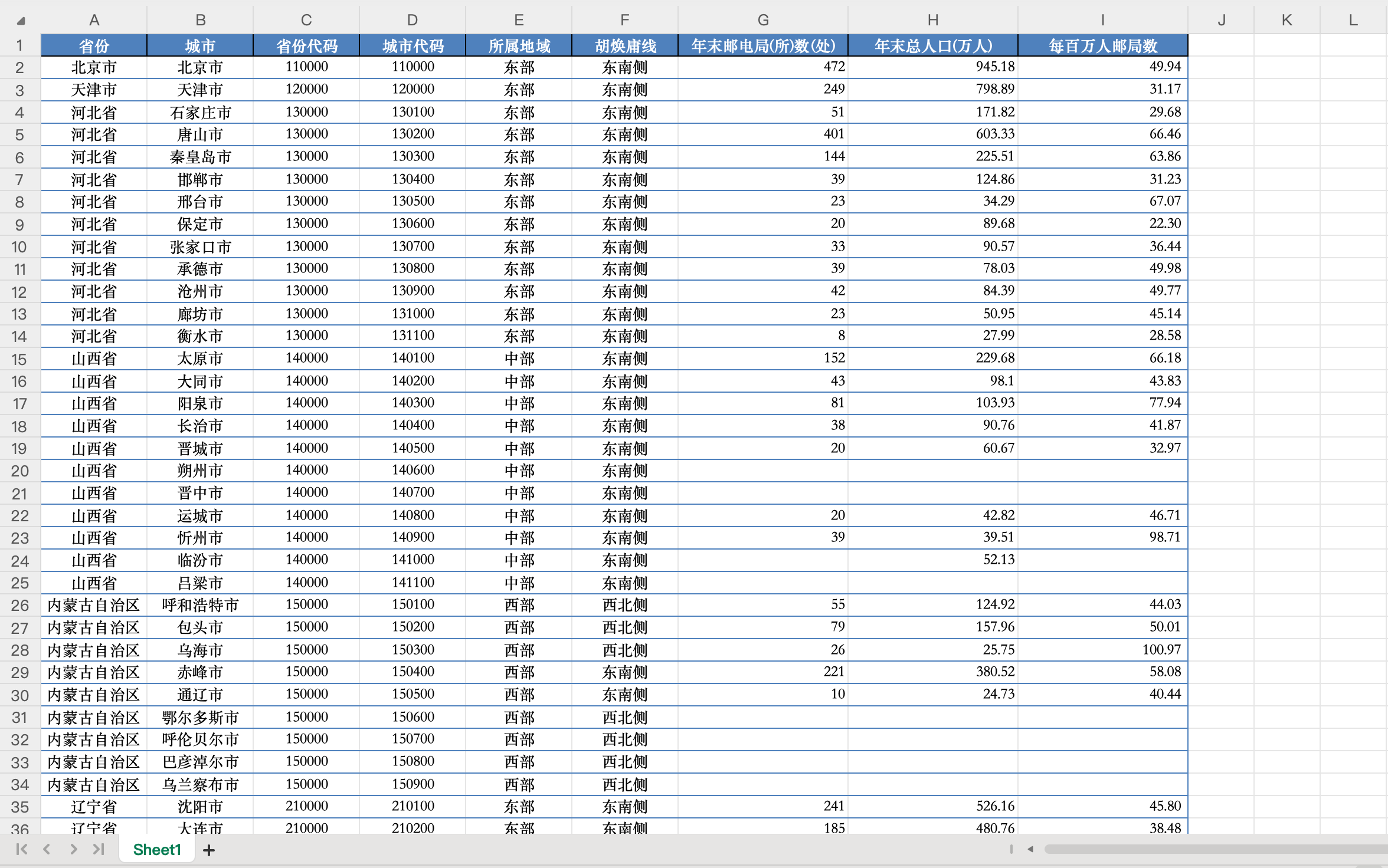 所属地域 | 胡焕庸线 | 年末邮电局数 |