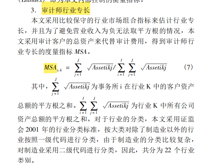 采用比较保守的行业市场组合指标来估计行业专长,并且为了避免营业收入为负无法取平方根的情况,采用审计客户的总资产来代替审计费用,得到审计师行业专长的度量指标MSA。