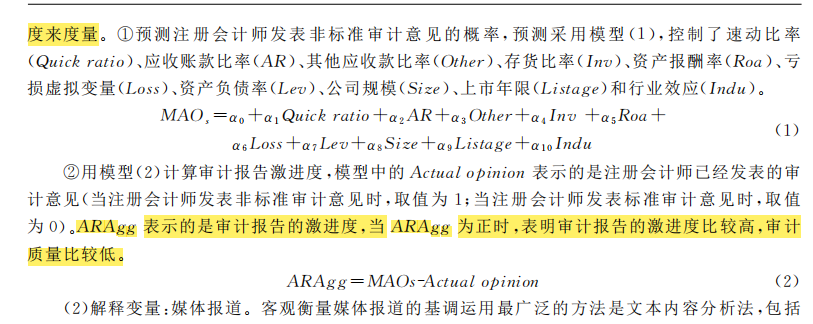 ②用模型(2)计算审计报告激进度,模型中的Actual opinion 表示的是注册会计师已经发表的审 计意见(当注册会计师发表非标准审计意见时,取值为1;当注册会计师发表标准审计意见时,取 值 为0)。ARAgg 表示的是审计报告的激进度,当ARAgg 为正时,表明审计报告的激进度比较高,审计质量比较低。