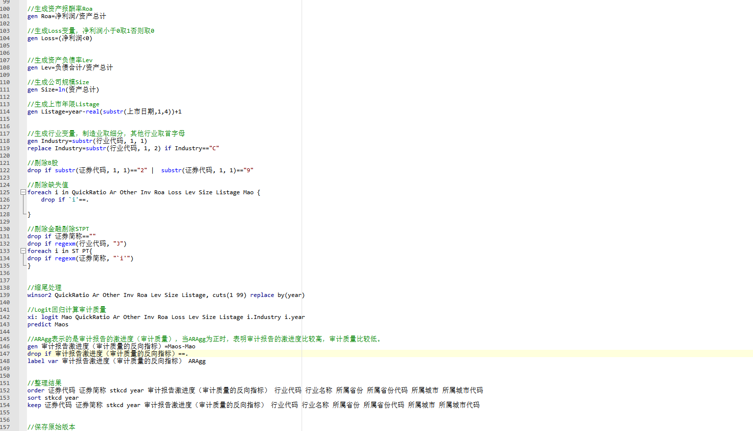 - 注:提供了剔除所需数据和剔除代码,若无需做该项剔除处理,自行删除相关代码重新运行即可行业参照证监会2012年行业分类标准,制造业用二级行业分类,其他用一级分类来计算并对连续型变量进行了1%和99%分位数的缩尾处理
