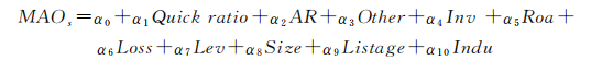 本文度量审计质量的方法为借鉴 Gul等的方法[29],用审计报告激进度来度量。①预测注册会计师发表非标准审计意见的概率,预 测 采 用 模 型(1),控制了速动比率(Quick ratio)、应收账款比率(AR)、其他应收款比率(Other)、存货比率(Inv)、资产报酬率(Roa)、亏损虚拟变量(Loss)、资产负债率(Lev)、公司规模(Size)、上市年限(Listage)和行业效应(Indu)。