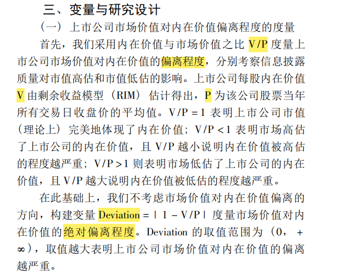 首先,我们采用内在价值与市场价值之比V/P度量上市公司市场价值对内在价值的偏离程度。上市公司每股内在价值V由剩余收益模型(RIM)估计得出,P为该公司股票当年所有交易日收盘价的平均值。V/P=1表明上市公司市值(理论上)完美地体现了内在价值;V/P<1表明市场高估了上市公司的内在价值,且V/P越小说明内在价值被高估的程度越严重;V/P>1则表明市场低估了上市公司的内在价值,且V/P越大说明内在价值被低估的程度越严重。