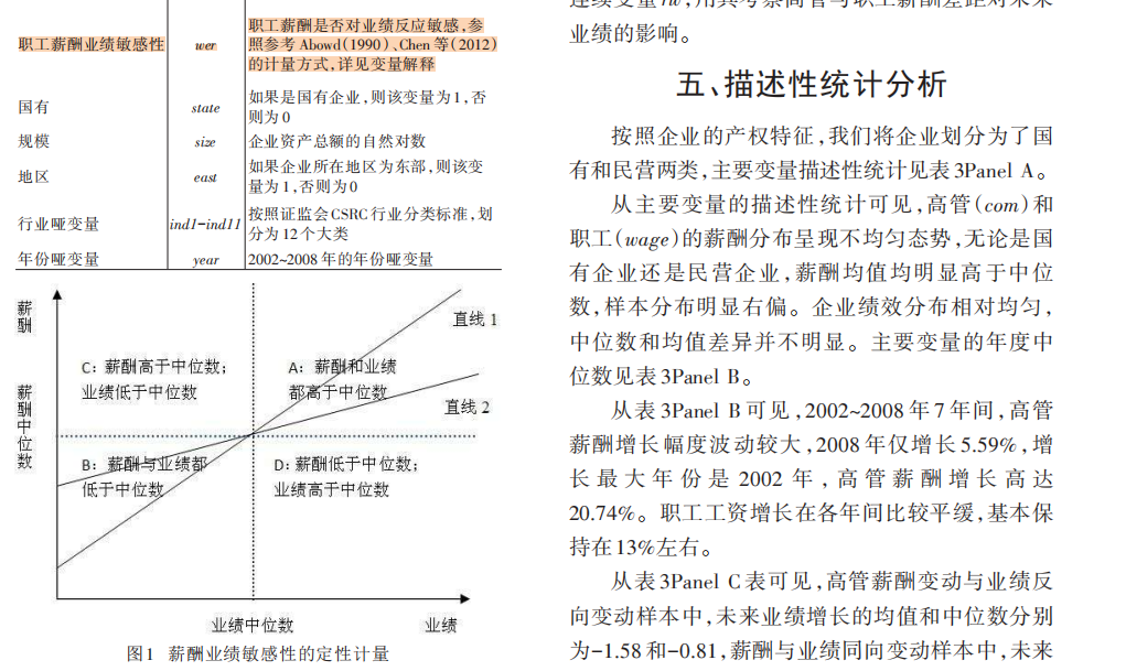 【职工薪酬业绩敏感性wer】职工薪酬业绩敏感性哑变量,如果企业职工新酬与企业业绩均高于或均低于中位数,则认为职工薪酬对业绩反应敏感,哑变量wer为1,否则wer为0。其中,职工工资,按参考文献中"(支付给职工以及为职工支付的现金-高管薪酬总额)/(企业在岗职工人数-高管人数),再取对数计算,经营业绩为企业ROA,具体定义在文献变量定义表中均有列示