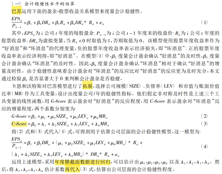 将上面两个式子代入巴苏模型,可得到用于估算公司层面的会计稳健性模型,这一模型为: