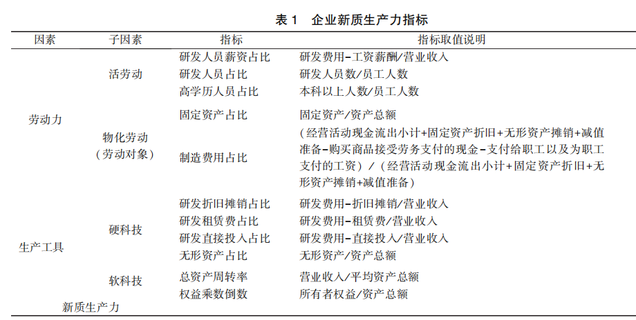 其中, 劳动力由活劳动和物化劳动 (劳动对象) 两个子要素组成; 生产工具由硬科技和软科技两个子因素组成。 考虑新质生产力中的创新内涵, 活劳动子因素的指标分别用研发人员薪资占比、 研发人员占比和高学历人员占比衡量; 物化劳动子因素的指标分别用固定资产占比和制造费用占比表示, 考虑到新质生产力的企业主要集中在装备制造的高精科技领域, 这类企业大多要依靠高端机器仪器生产, 机器生产取代人, 这些企业的制造费用占比比其他企业要高,因此在指标选择中也加入了制造费用占比。