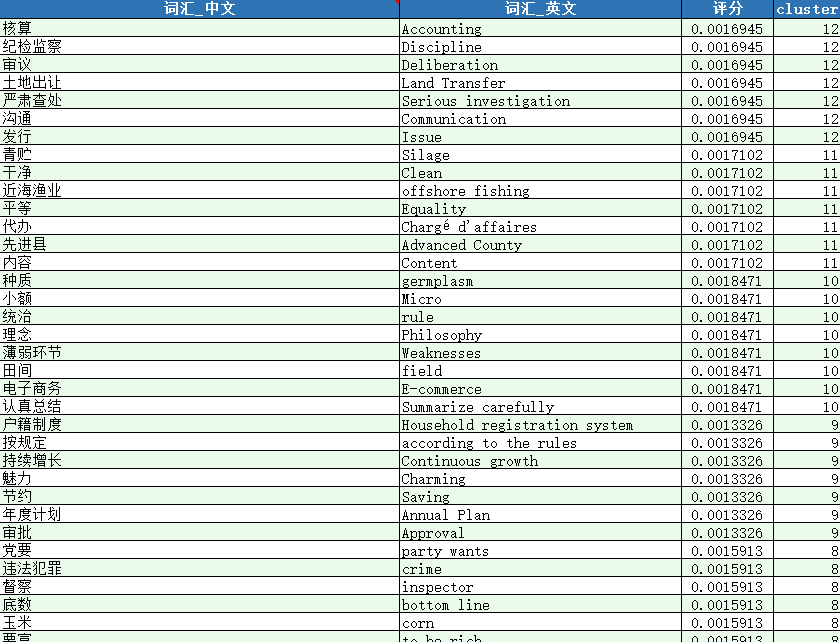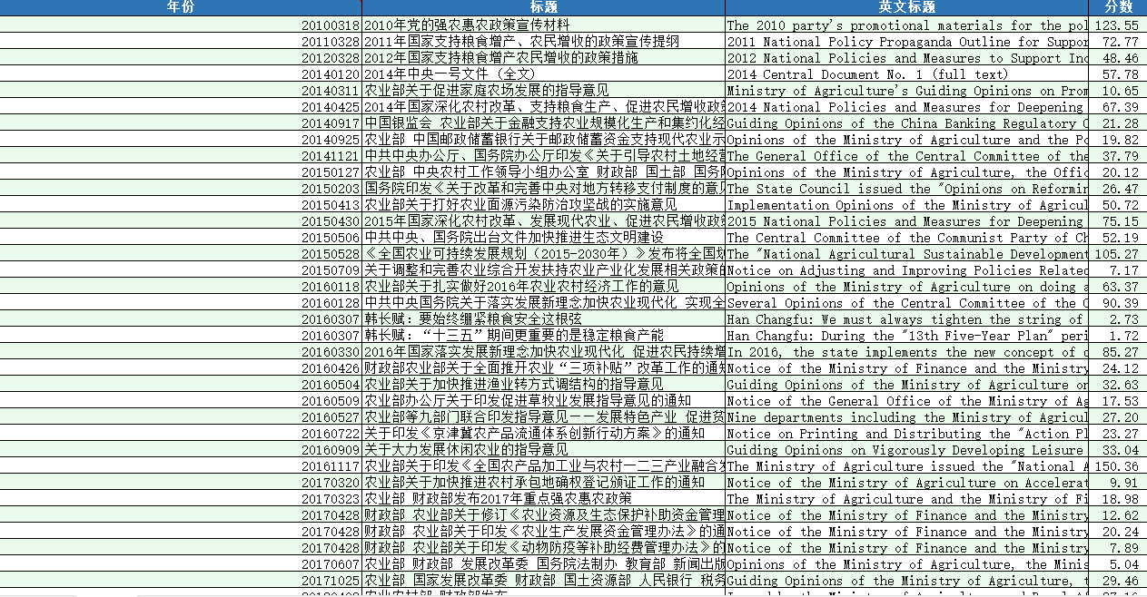 [1] Wu Yehui, et al. Metricizing policy texts: Comprehensive dataset on China’s Agri-policy intensity spanning 1982–2023[J]. Scientific Data, 2024, 11(1): 528. 二. 数据指标| 年份 | 中文标题 | 英文标题 | 分数 | 词汇中文 | | 词汇英文 | 评分 | cluster | | |