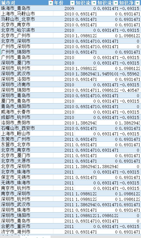 变量名称 | 城市对/省份对 | 年份 | 知识流量(高至低) | 知识流量(低至高) | 知识净流量(高至低) |