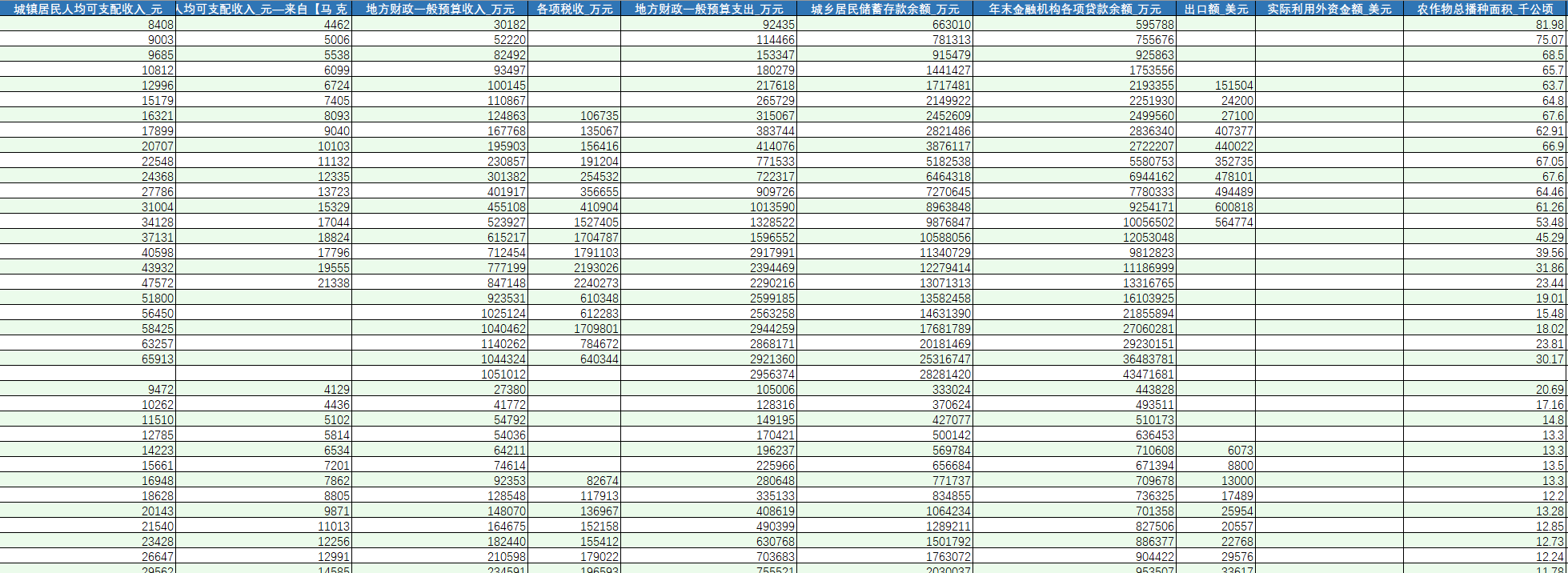 | 第三产业增加值 | 农业增加值 | 牧业增加值 | 人均地区生产总值 | 城镇单位在岗职工平均工资 |