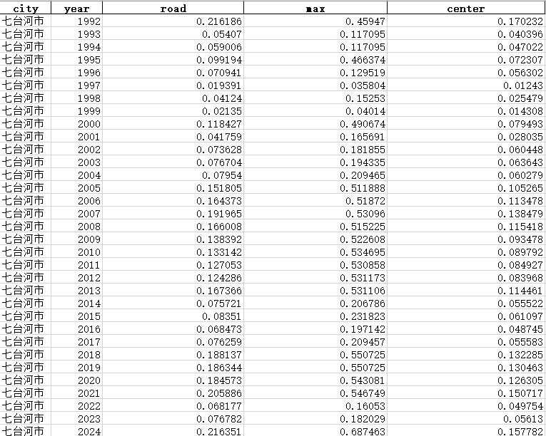 这些数据的意义重大,road 指标在很大程度上可反映市内绝大多数居民的出行成本,包括金钱、时间和体力等方面,为评估城市交通规划合理性提供了量化依据;max 指标有助于了解城市空间布局的极限情况,对城市基础设施布局、公共服务资源配置等具有参考价值。center 指标能直观体现城市中心的辐射能力与居民往返市中心的便捷程度,为优化城市中心功能布局、均衡城市资源分配提供数据支持。整体而言,该数据能为城市规划者制定科学的城市发展策略、优化城市空间结构,以及为研究者深入探究城市发展动态与规律提供扎实的数据支撑。