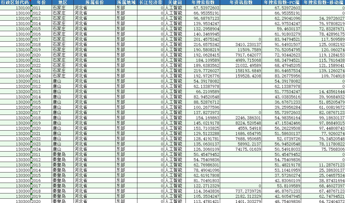 - 数据名称:中国人工智能关注度数据(2011-2024)