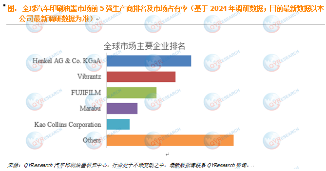 竞争格局呈现 “寡头主导、区域补充、创新突围” 特征。QYResearch 数据显示,2024 年全球前五大汽车印刷油墨生产商合计占据 67% 市场份额,头部企业优势显著。国际巨头如美国 Kao Collins Corporation、德国 Marabu、日本 FUJIFILM,凭借功能性油墨(导电、耐高温)技术优势,主导中高端市场;区域性企业依托本地汽车产业链,聚焦外饰标识、按钮丝印领域,提供高性价比定制化产品;新兴企业则瞄准 3D 打印油墨、纳米银导电油墨等细分赛道,贴合新能源汽车需求快速突破。