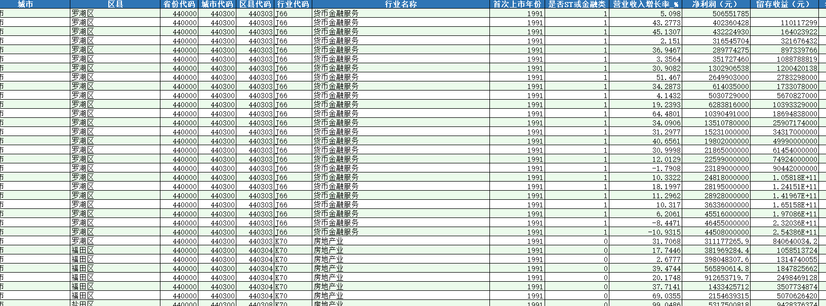 | 城市代码 | 区县代码行业代码 | 行业名称 | 首次上市年份是否ST或金融类 | 营业收入增长率 |