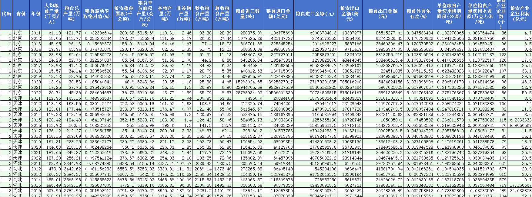 二. 数据指标| 代码 | 省份 | 年份 | 人均粮食产量千克人 | 粮食总产量万吨 | | 粮食波动率取绝对值 | 粮食播种面积千公顷 | 粮食单位面积产量公斤公顷 | 谷物产量万吨 | 非谷物产量万吨 | | 秋收粮食产量万吨 | 夏收粮食产量万吨 | 粮食进口数量吨 | 粮食进口金额美元 | 粮食进口金额元 | | 粮食出口金额美元 | 粮食出口金额元 | 粮食外贸依存度 | 单位粮食产量使用耕地面积公顷吨 | 单位粮食产量使用水资源万立方米吨 | | 粮食产业企业数个 | 粮食产业企业利润亿元 | 粮食总产量 | 5年移动平均值 | 粮食波动率2 | | 粮食波动率取绝对值 | | | | |