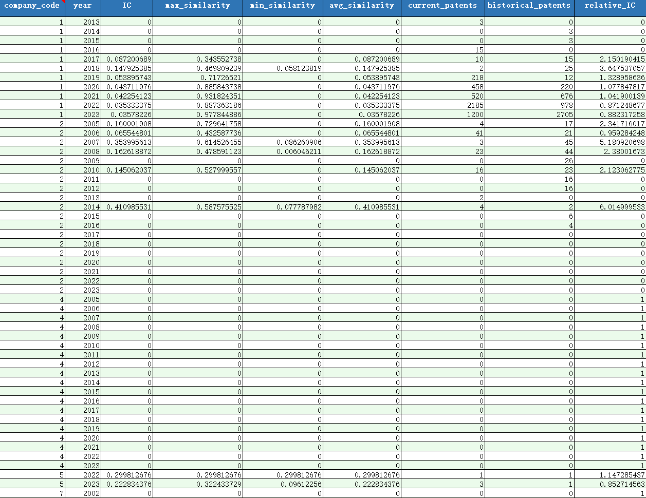 [1]孙雅慧,时省,彭飞,等.研发补贴与渐进式创新锁定:基于机器学习的专利文本分析[J].经济研究,2024,59(11):89-105. 二. 数据指标| companycode | year | IC | maxsimilarity | minsimilarity | | avgsimilarity | currentpatents | historicalpatents | relativeIC | |