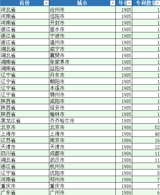 | 省份 | 城市 | 年份 | 专利数量 |