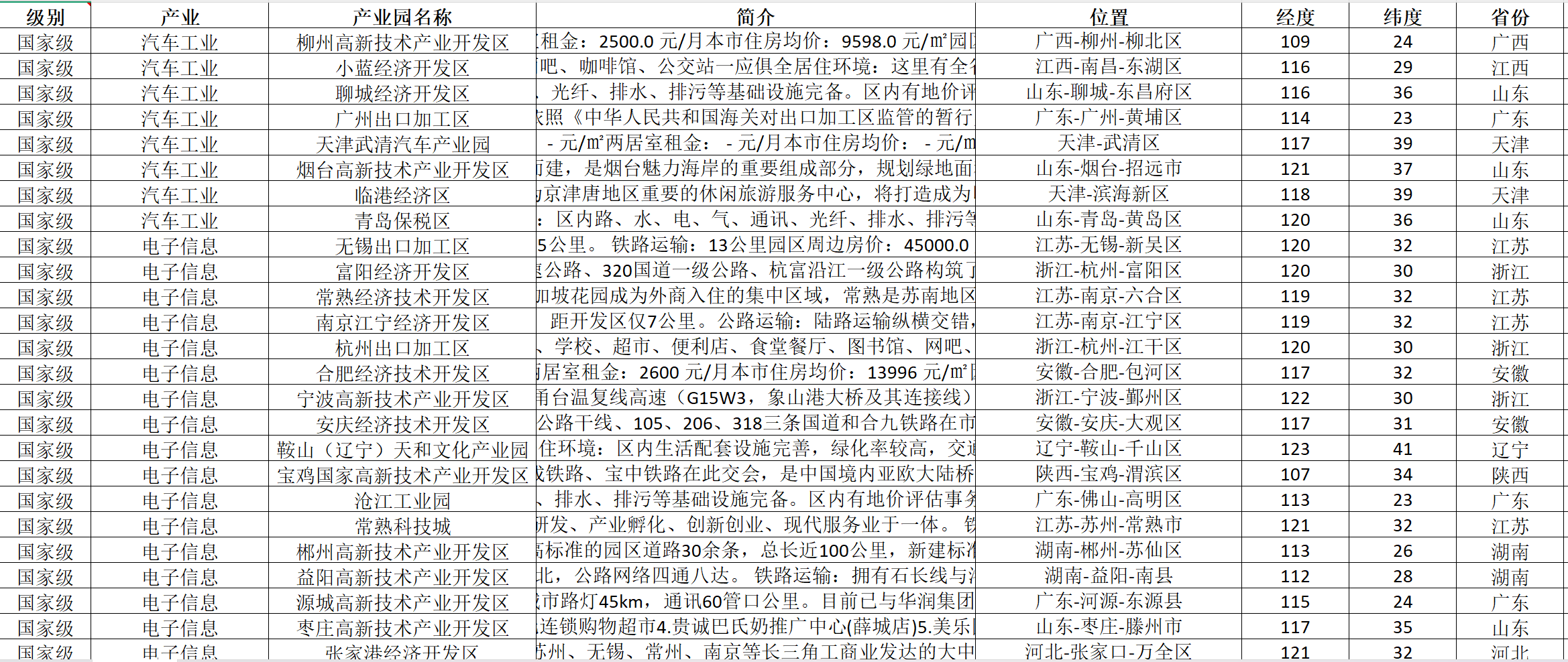 本分享数据涵盖10w+产业园区信息,园区级别含国家级、省级、市级、区县级以及乡镇级,指标涉及园区名称、简介、地理位置、经纬度等,以期为相关研究者实现园区精准运营与高效发展提供关键数据支撑
