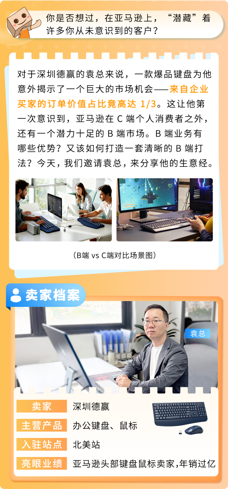 袁总坦言,那款爆品键盘带来的最大惊喜,并非是C端的火爆销量,而是一个完全意想不到的新大陆——亚马逊企业购。“最初,我们甚至没有意识到企业买家有这么多,”他回忆道。还是亚马逊的客户经理主动联系并告知来自企业买家的订单价值占比竟高达1/3。