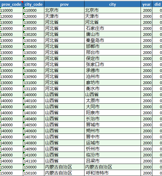 二. 数据指标| provcode | citycode | prov | city | year | | did | | | | |