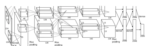 为了提升计算能力,AlexNet 实际上设计了两个 GPU 并行计算的结构,如下图所示: