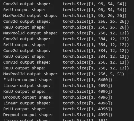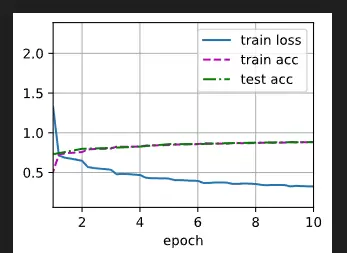 由于数据集仍采用之前的 Fashion-MNIST 数据集,在模型的输入层通道数从原来的 3 改为 1,且最后一层输出长度从原来的 1000 修改为 10。
