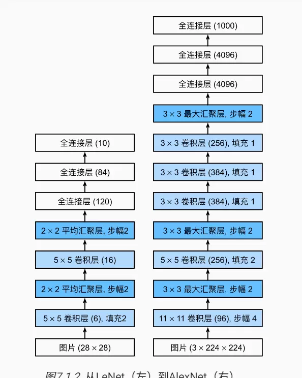 除了图中可见的改进之外,还有一些未展示的改进:1. AlexNet 将激活函数从 sigmoid 更改为 ReLU,ReLU 的计算更简单,并且能有效避免梯度消失问题。2. AlexNet 通过暂退法控制全连接层的模型复杂度,而 LeNet 只使用了权重衰减。3. 为了进一步扩大数据量,AlexNet 在训练时增加了大量图像增强数据,如翻转、裁剪和变色等,这使得模型更加健壮,更大的样本量有效减少了过拟合。