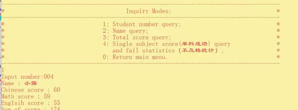 cout<<"* 4: Single subject grade(单科成绩) query *"<<endl;