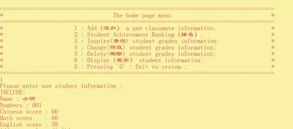 cout<<"* 1 : Add(添加) new classmate data; *"<<endl;