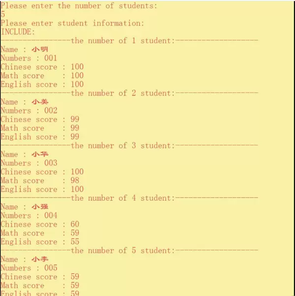 cout<<"Chinese score : "; cin>>stu[i].chinese;