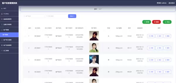 如图5.1显示的是客户管理列表页面。此页面为管理员提供了查看、新增、修改和删除客户管理等功能。