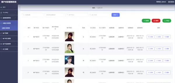 沟通记录信息管理页面提供的操作包括:新增沟通记录、修改沟通记录和删除沟通记录。下图是沟通记录信息管理页面。