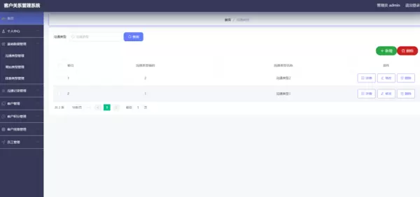 沟通记录类型管理页面显示所有类型的沟通记录。在此页面,管理员可以添加新的沟通记录类型、编辑现有的沟通记录类型,并快速删除失效的沟通记录类型。下图是沟通记录类型管理页面。