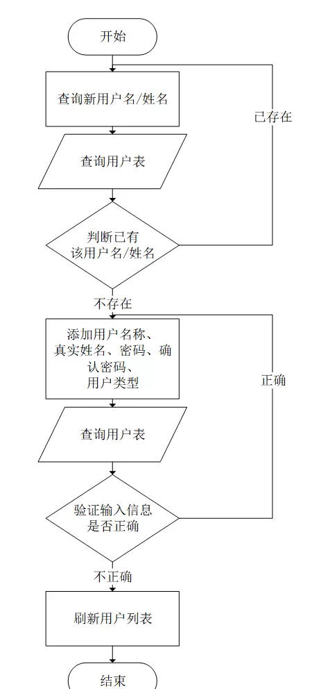 添加新用户的流程首先查询用户名是否已存在,如果已存在,则需重新选择用户名并输入其他相关信息。在向数据库中添加新用户前会先验证数据的完整性,信息正确且完整时,返回并刷新用户列表;若信息不正确,则回到输入信息的步骤。此流程如图3-5所示。