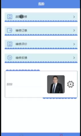用户成功登录后,点击“我的”进入个人页面,在此页面可以对个人中心、故障报修、维修订单、维修评价、维修反馈等进行详细操作。用户功能界面如图5-4所示。