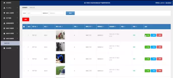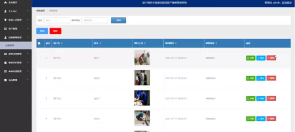 管理员点击故障报修管理。在故障报修页面输入姓名和维修地址进行查询,新增或删除故障报修列表,并根据需要对故障报修详情信息进行详情、修改或删除操作;如图5-11所示: