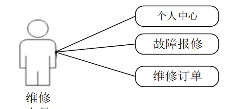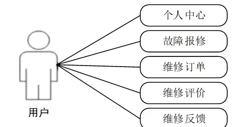 用户用例图基于发布人的需求分析,包括个人中心、故障报修、维修订单、维修评价和维修反馈等。用户用例图如下所示: