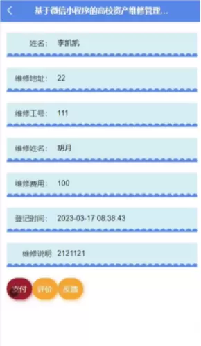 维修订单:在维修订单界面可以看到姓名、维修地址、维修工号、维修姓名、维修费用、登记时间、维修说明等详细信息;并进行支付、评价或反馈操作;维修订单详情如图5-6所示。