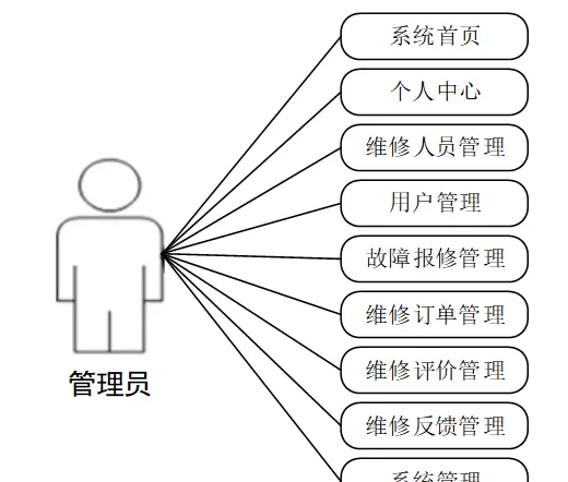 管理员用例图基于管理员的权限需求及对系统的管理需求分析,主要包括系统首页、个人中心、维修人员管理、用户管理、故障报修管理、维修订单管理、维修评价管理、维修反馈管理和系统管理等。管理员用例图如下所示:
