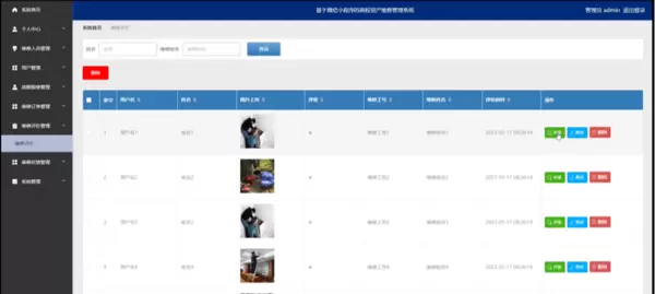 管理员点击维修评价管理。在维修评价页面输入姓名和维修姓名进行查询,新增或删除维修评价列表,并根据需要对维修评价详情信息进行详情、修改或删除操作;如图5-13所示: