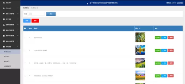 管理员点击系统管理。在通知公告页面输入标题进行查询,新增或删除通知公告列表,并根据需要对通知公告详情信息进行详情、修改或删除操作;还可以对关于我们、系统简介、轮播图管理进行相应操作;如图5-15所示: