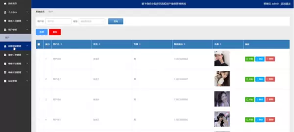 管理员点击用户管理。在用户页面输入用户名和选择性别进行查询,新增或删除用户列表,并根据需要对用户详情信息进行详情、修改或删除操作;如图5-10所示: