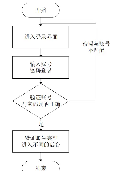 登录流程是系统的首个步骤,首先输入账号和密码进行验证,系统会检查账号与密码是否匹配,如果正确,则根据账号类型进入不同的后台;若不正确,则返回至登录界面重新操作。此流程如图3-4所示。